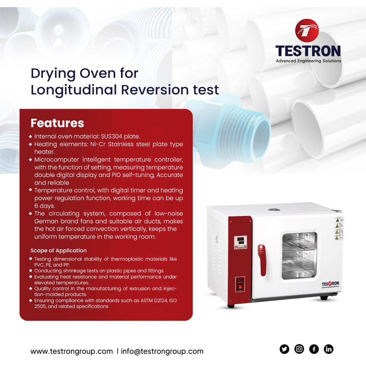 If your laboratory or manufacturing facility requires reliable Longitudinal Reversion Test Equipment, Testron offers advanced Longitudinal Reversion Testing Oven systems designed for accurate pipe stress testing.