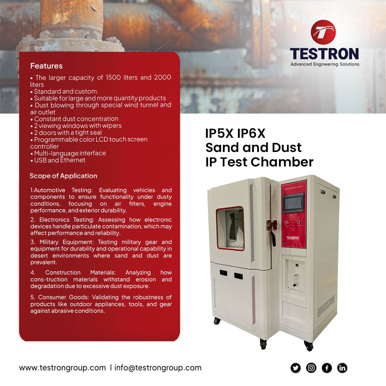 Application of IP5X IP6X Sand and Dust IP Test Chamber-Testron group USA Dust and sand ingress can severely impact the performance and longevity of critical components. The sand and dust IP test chamber recreates natural desert-like conditions, where fine particles are suspended and circulated under controlled airflow and temperature. These tests help determine if seals, enclosures, and protective coatings can withstand long-term exposure to sand and dust without compromising function or safety. The Testron IP5X and IP6X Sand and Dust IP Test Chambers are specifically designed for IP ratings that evaluate protection against solid particles. IP5X testing assesses dust protection where partial ingress is allowed, while IP6X testing ensures complete dust-tight sealing. With multiple chamber capacities ranging from 800 to 2000 liters, Testron’s chambers cater to various testing requirements, from small electronics to large automotive assemblies.